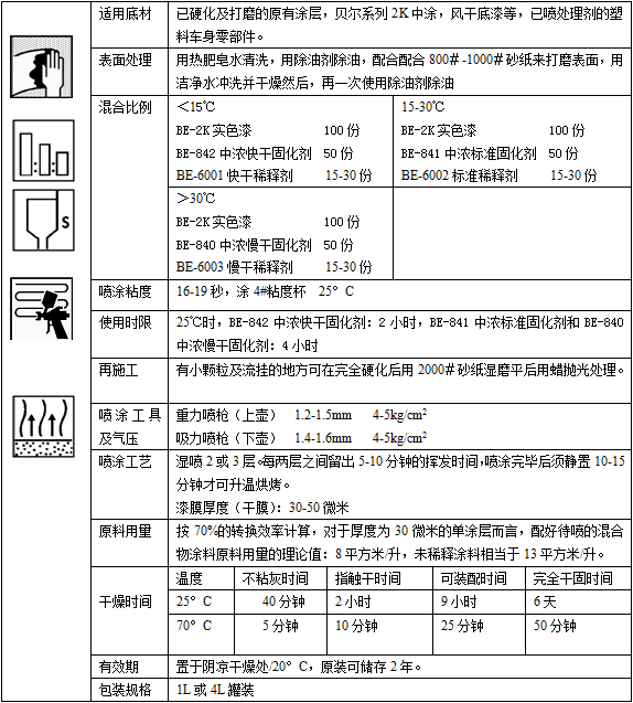 3. 添加过固化剂的面漆应尽快用完,不可保存再用,使用完后请即时将所有喷涂工具用稀释剂清洗干净,否则干垢难以清除。