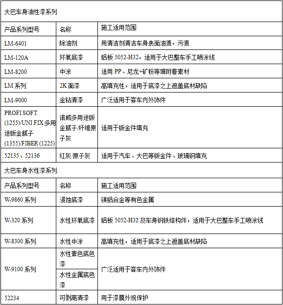客车整车涂料:环氧底漆、聚酯、丙烯酸中涂漆、丙烯酸面漆、聚氨酯清漆